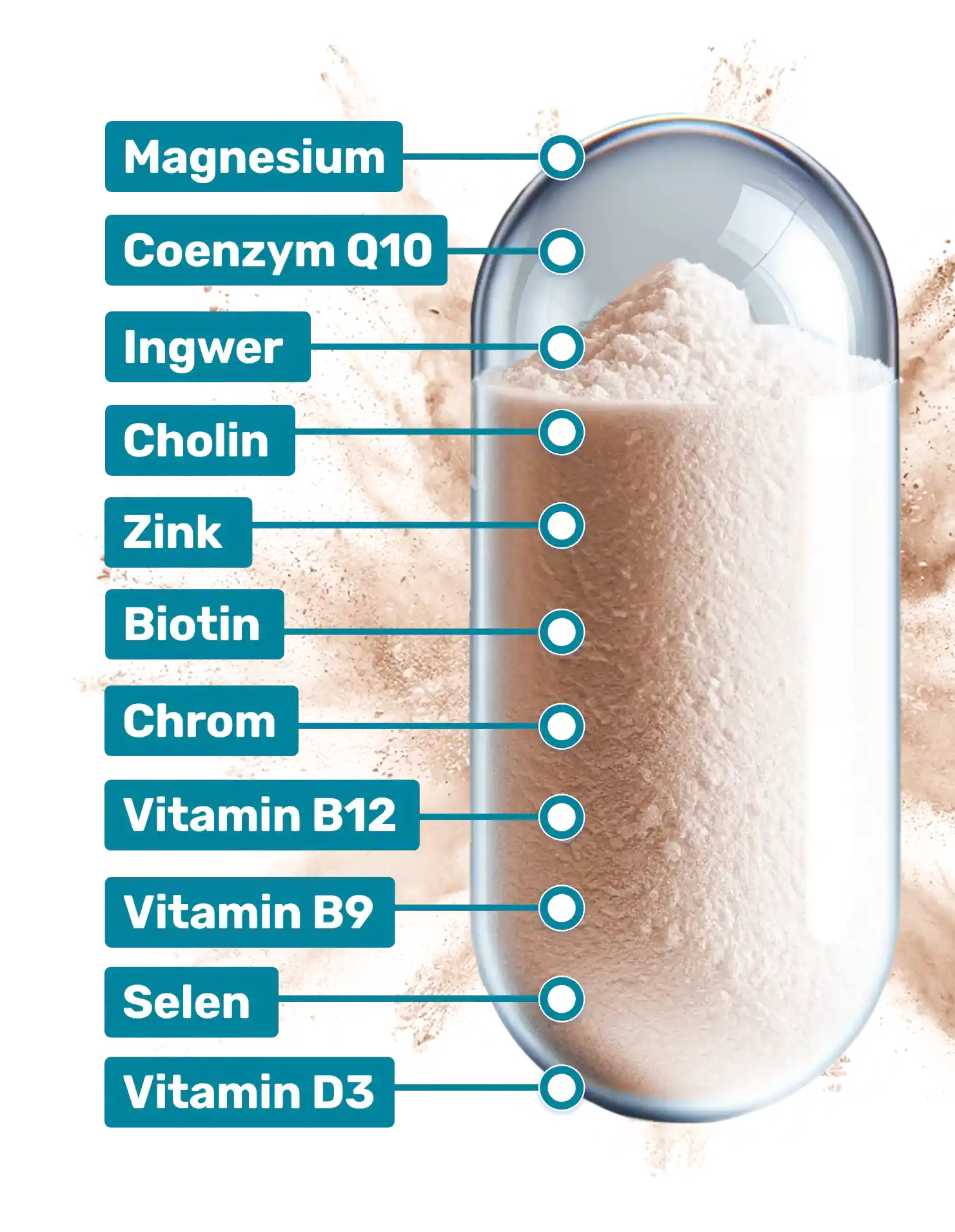 Magnesiumoxid, Reismehl vegan, Coenzym Q10 (Ubichinon), Zinkbisglycinat, Cholin Bitartrat, Ingwer Pulver, D-Biotin, Chrom(III)-Chlorid Hexahydrat, Methylcobalamin, Pteroylmonoglutaminsäure, Natriumselenit, Cholecalciferol, Hydroxypropylmethylcellulose (Kapselhülle).