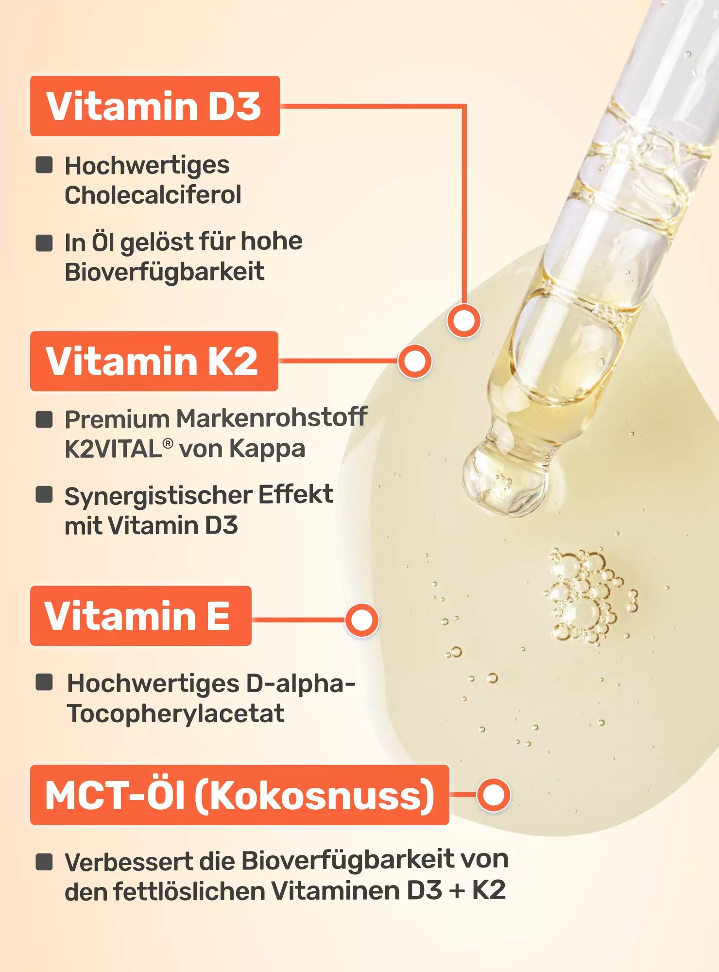 Da Vitamin D ein fettlösliches Vitamin ist, ist eine Einnahme in Kombination mit Öl wichtig. Glycowohl® setzt daher auf hochwertiges MCT-Öl aus der Kokosnuss als Träger. Die Kombination mit bioaktivem Vitamin K2 (K2VITAL®) sorgt zudem für einen synergistischen Effekt, insbesondere im Hinblick auf die Erhaltung normaler Knochen, da K2 hilft, Calcium im Körper richtig zu verwerten.