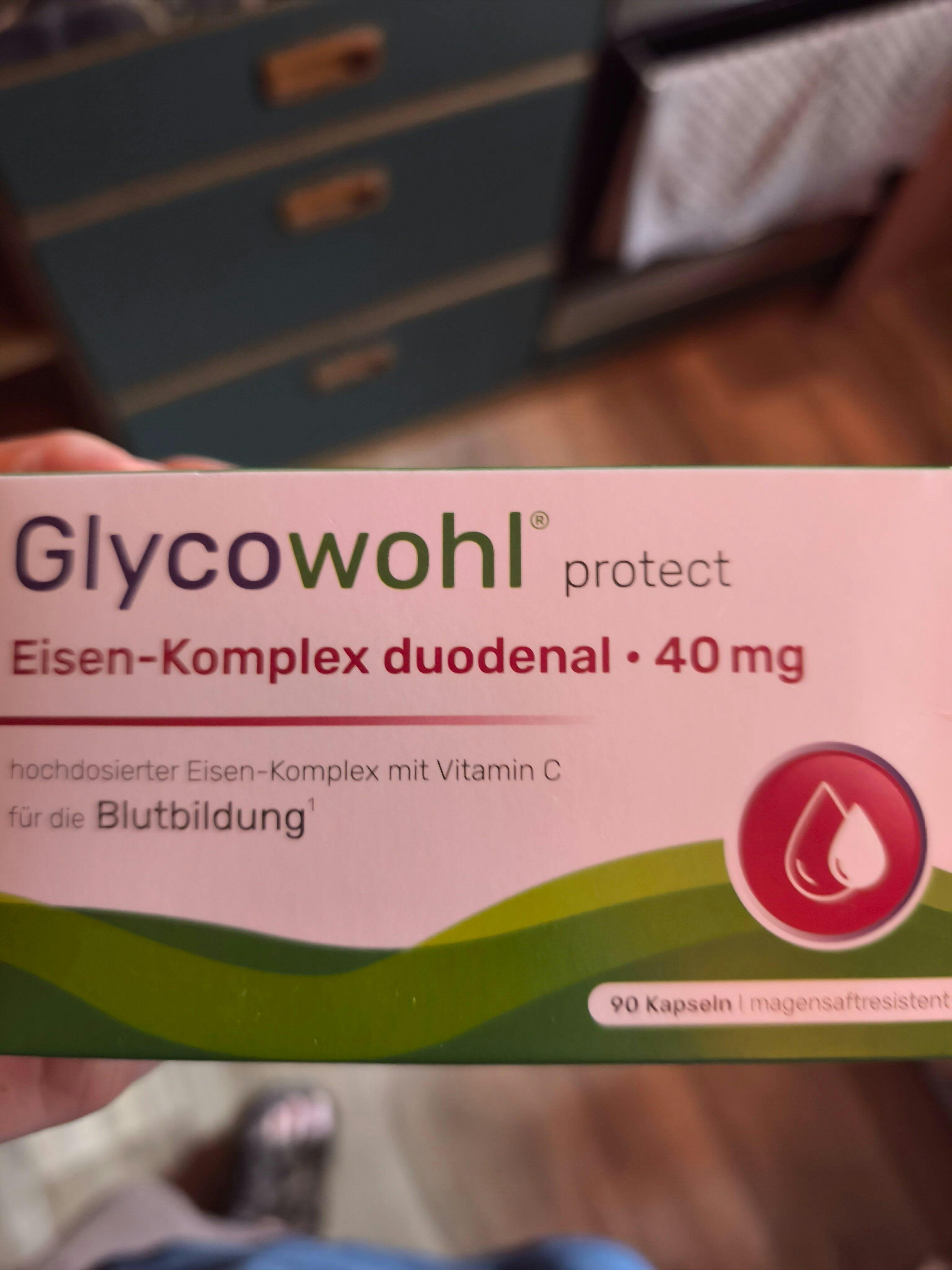 Einmal täglich 1 Kapsel unzerkaut mit ausreichend Wasser einnehmen. Die Einnahme sollte entweder morgens nüchtern (ca. 1 Stunde vor dem Frühstück) oder in ausreichendem Abstand von etwa 2 Stunden vor oder nach der Mahlzeit erfolgen. Glycowohl® protect Eisen-Komplex duodenal 40 mg + Vitamin C ist für einen regelmäßigen und langfristigen Verzehr geeignet.