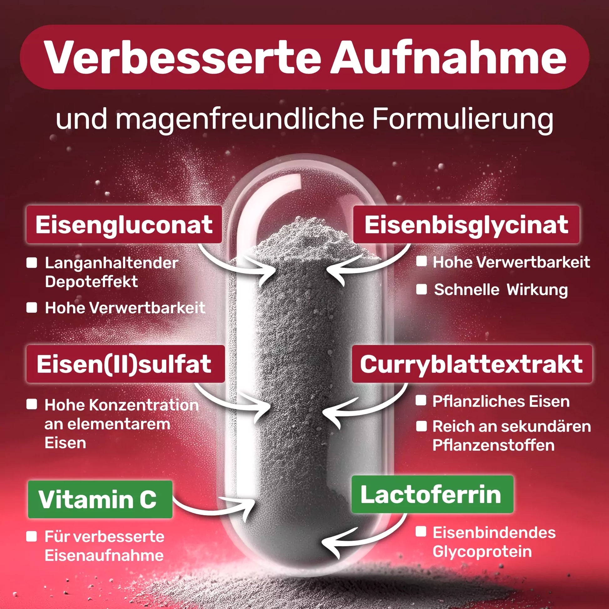 Reisstärke (Oryza), Kapselhülle (Überzugsmittel (Hydroxypropylmethylcellulose, Neutrales Methacrylat-Copolymer)), Eisengluconat, Eisenbisglycinat, Eisensulfat, Curryblattextrakt 10:1 (Murraya koenigii, enthält 3 % Eisen), Lactoferrin aus Kuhmilch, Calcium-L Ascorbat.