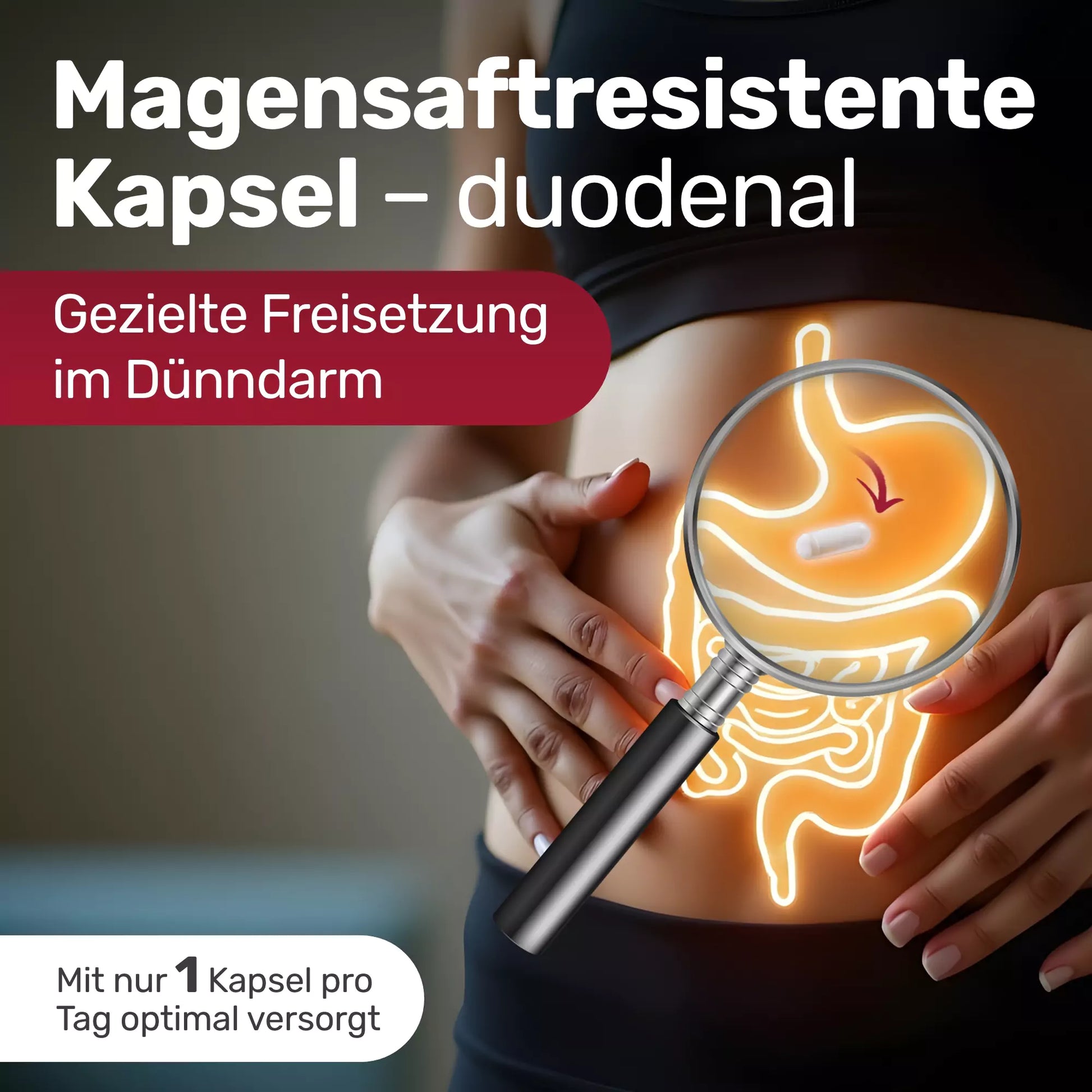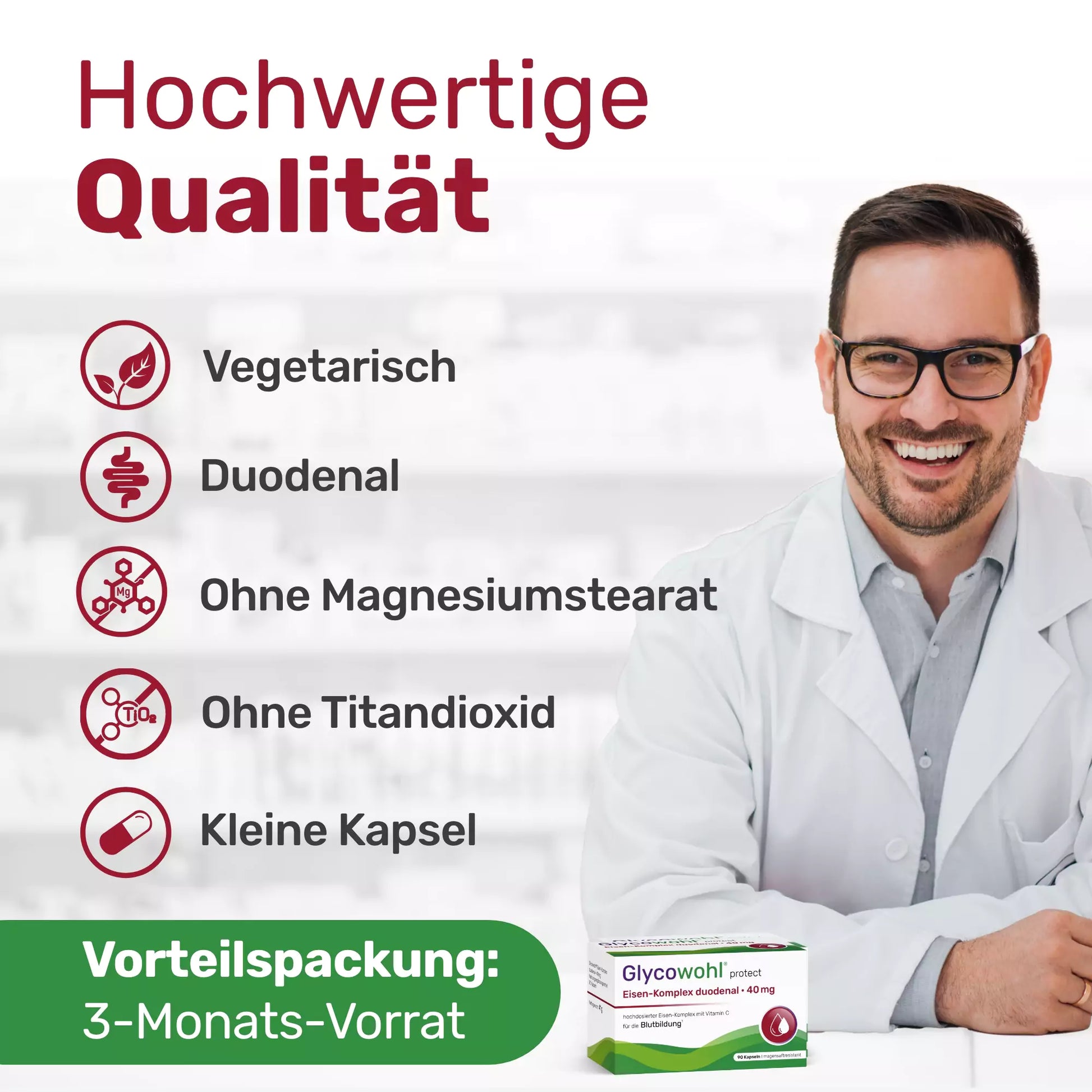 Glycowohl® protect Eisen-Komplex duodenal · 40 mg + Vitamin C ist ein vegetarisches Nahrungsergänzungsmittel und enthält hochdosiertes Eisen in einer magensaftresistenten Kapsel. Die 40 mg Eisen setzen sich aus einer einzigartigen Kombination von vier hochwertigen Eisenformen zusammen: Eisenbisglycinat, Eisengluconat, Eisensulfat und natürlichem Eisen aus Curryblattextrakt. Ergänzt wird die Formulierung um 20 mg Lactoferrin und 12 mg gepuffertes, magenfreundliches Vitamin C für eine verbesserte Aufnahme des Eisens⁶. Eisen ist ein lebensnotwendiges Spurenelement, das im menschlichen Körper eine zentrale Rolle spielt, indem es die Blutbildung¹ und den Sauerstofftransport unterstützt⁴ und zur Verringerung von Müdigkeit und Ermüdung³ beiträgt.