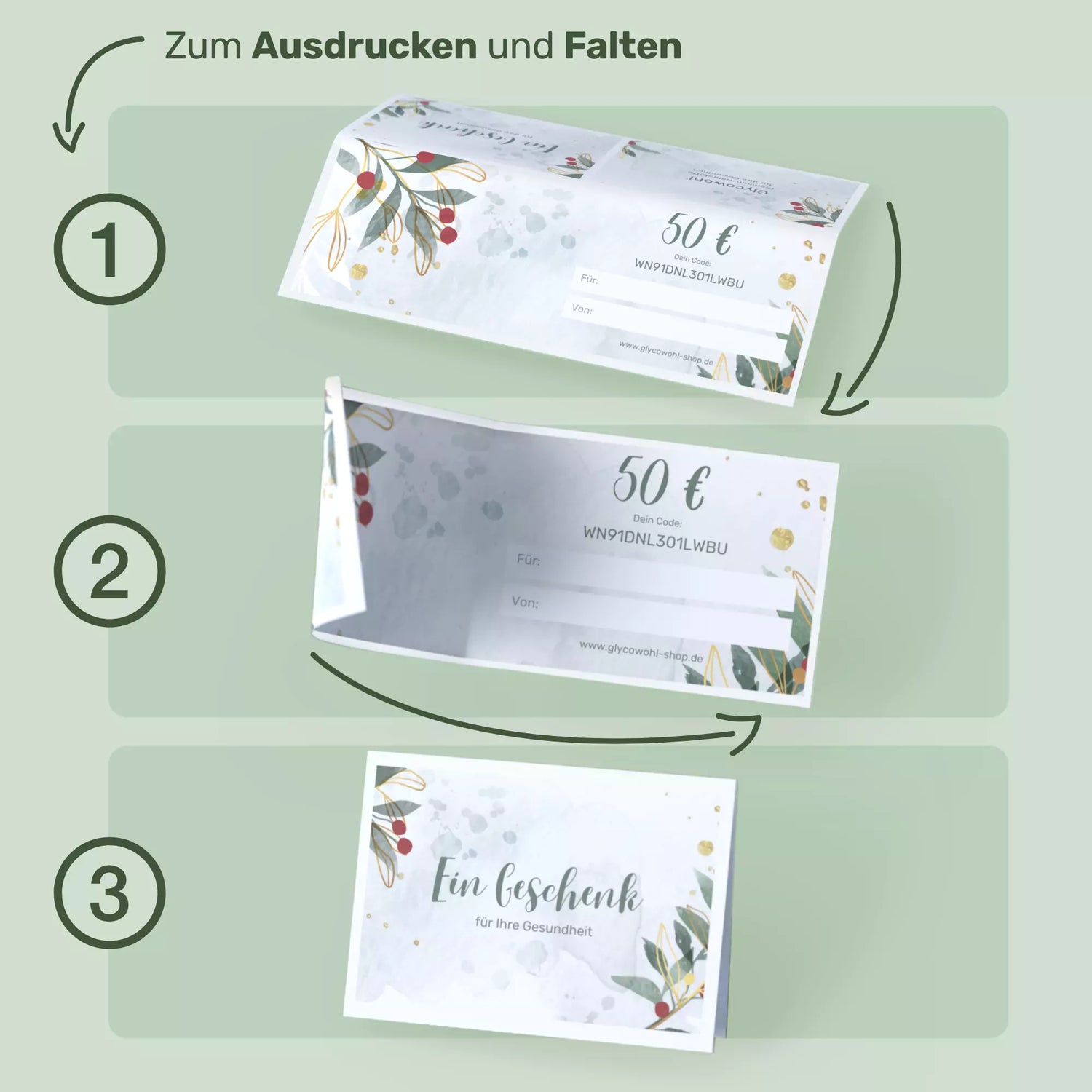 - Falten Sie den Gutschein entsprechend der Abbildung und schenken Sie Ihren Liebsten Gesundheit zu Weihnachten.
